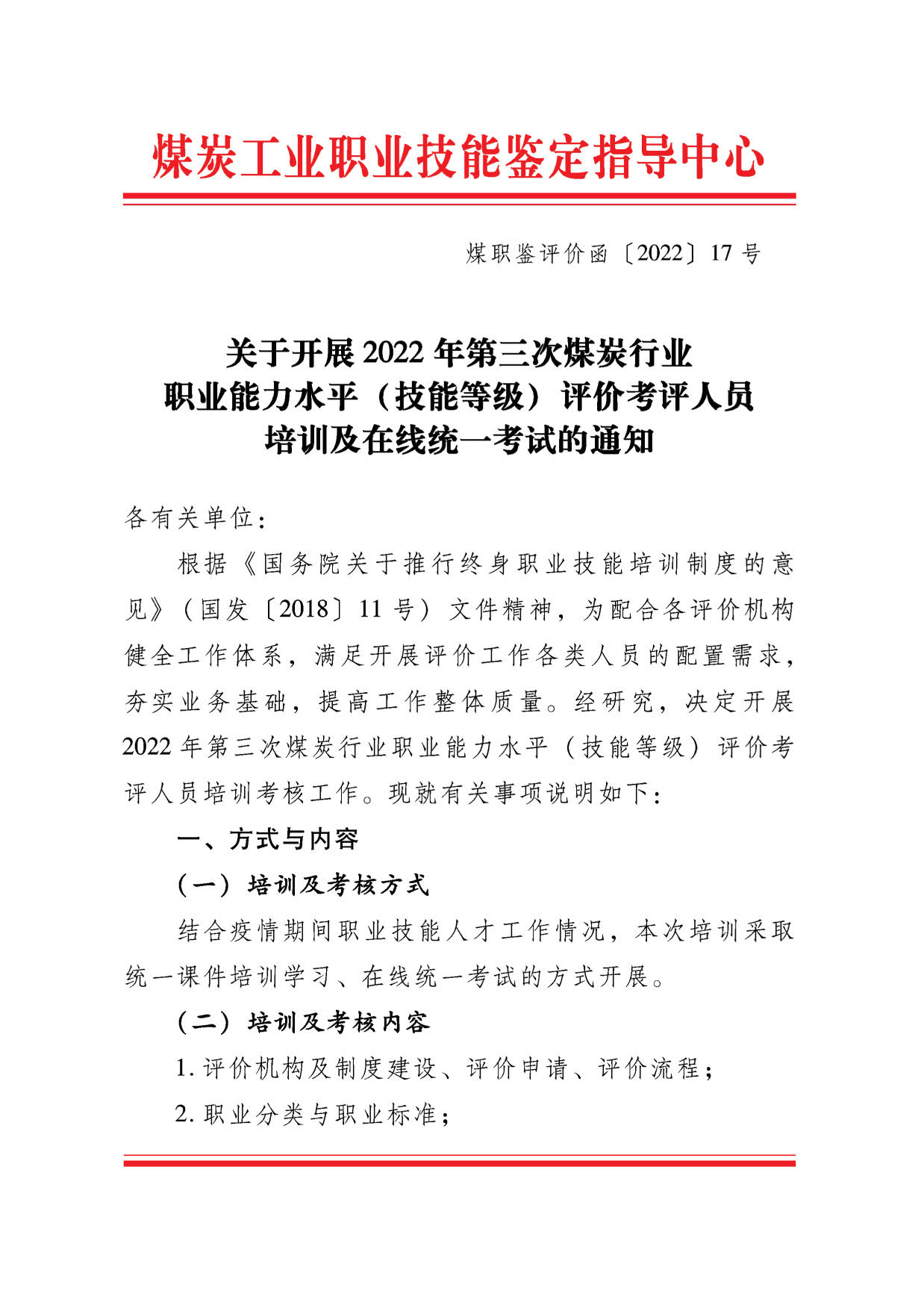 - 关于开展2022年第三次煤炭行业职业能力水平(技能等级)评价考评人员培训及在线统一考试的通知