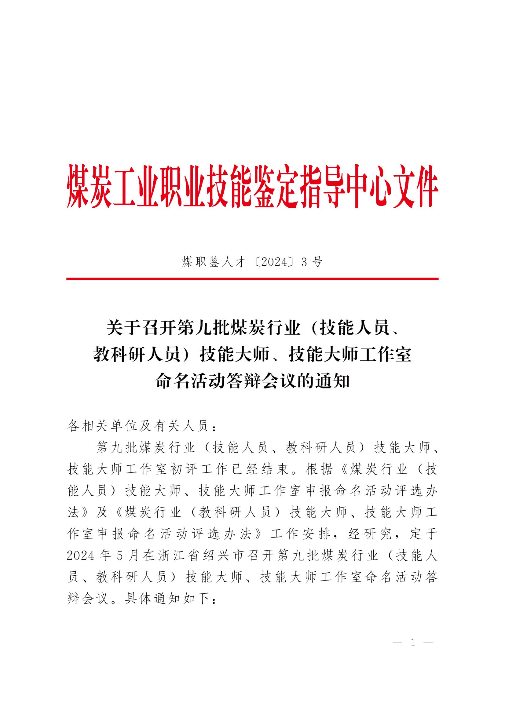 - 关于召开第九批煤炭行业(技能人员、教科研人员)技能大师、技能大师工作室命名活动答辩会议的通知