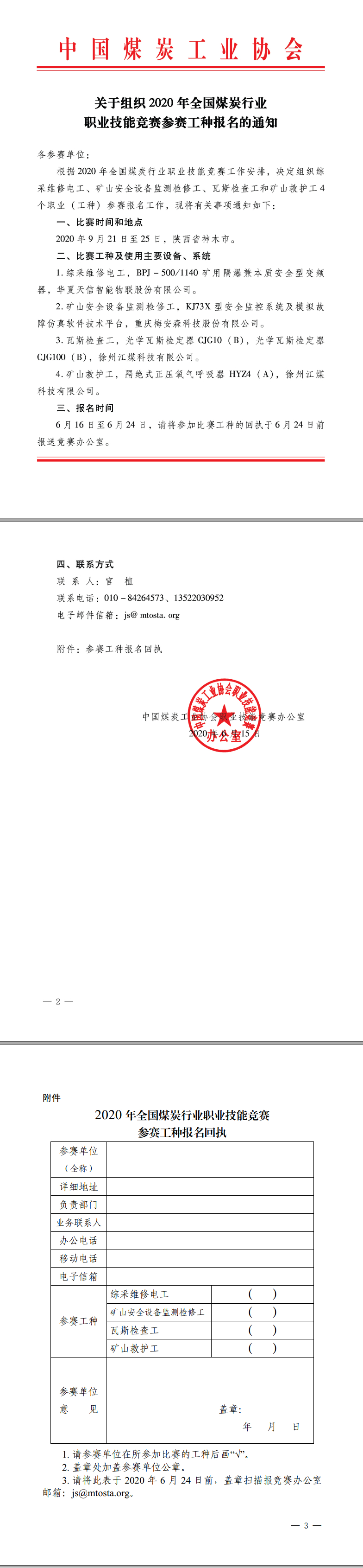 关于组织2020年全国煤炭行业职业技能竞赛参赛工种报名的通知