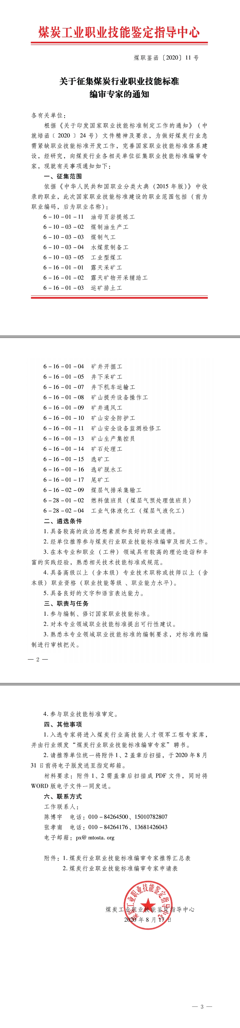 - 关于征集《煤矿智能开采员》等新增工种技能标准(评价规范)开发单位和编审专家的通知