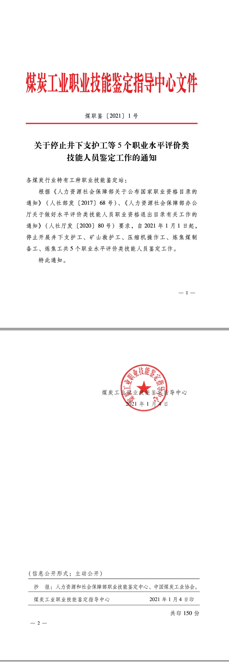 关于停止井下支护工等5个职业水平评价类技能人员鉴定工作的通知